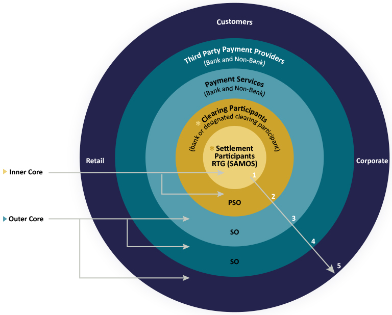 The first layer consists of settlement participants, which all have settlement accounts with the South African Reserve Bank (SARB). Settlement of payment obligations between these participants is achieved through the South African Multiple Options Settlement (SAMOS) system which is owned and operated by the SARB. At this stage, only South African registered banks can hold settlement accounts. Banks or designated participants who do not have settlement accounts may be sponsored by settlement participants.